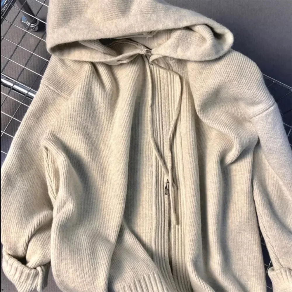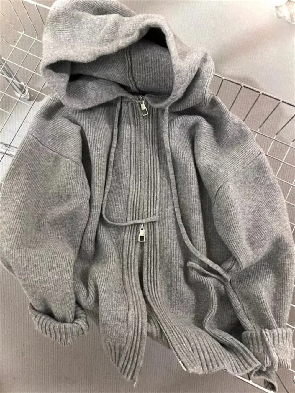 Oupilladt-Pull à capuche gris coréen pour femme, sweat à capuche double fermeture éclair épaissi, printemps, automne, hiver, extérieur