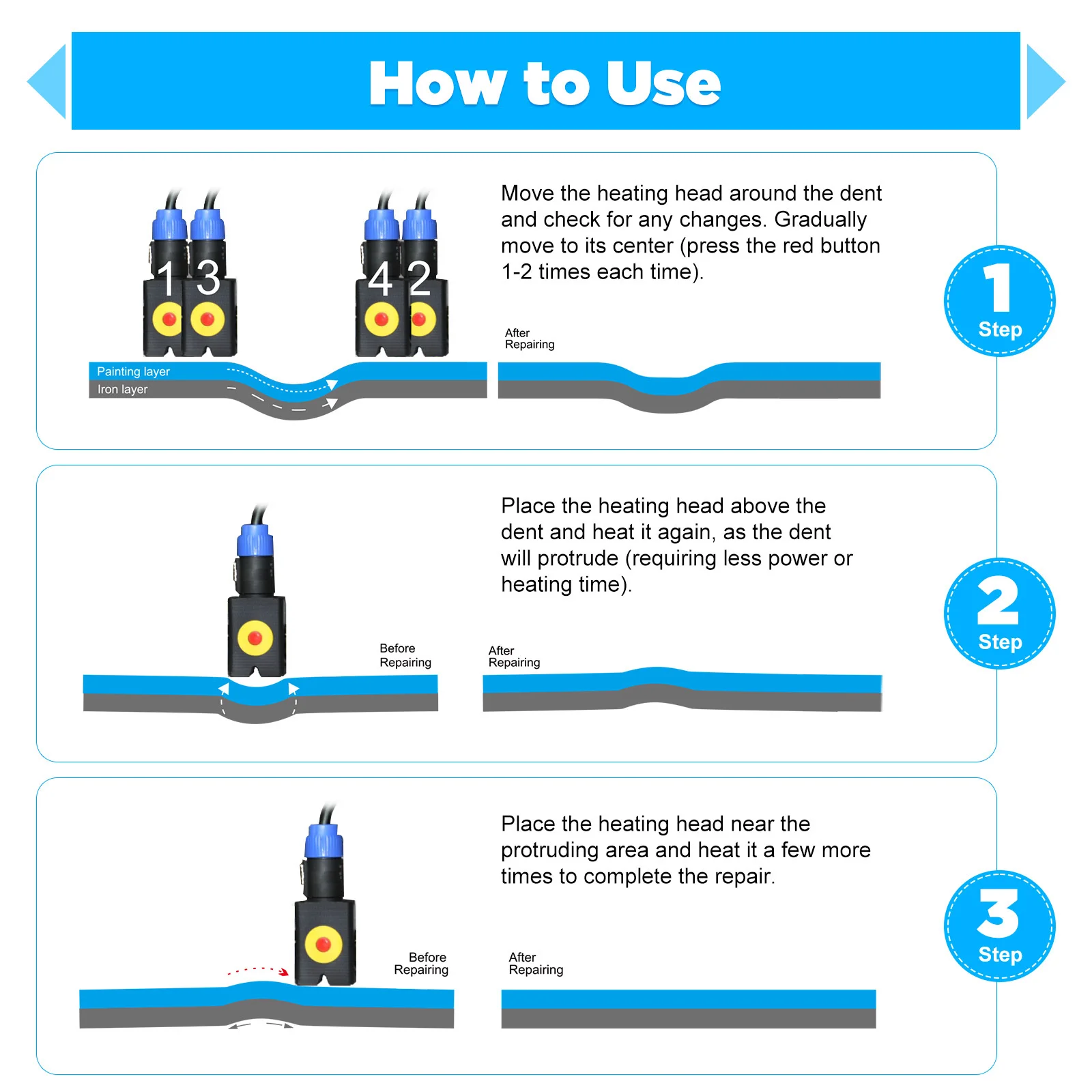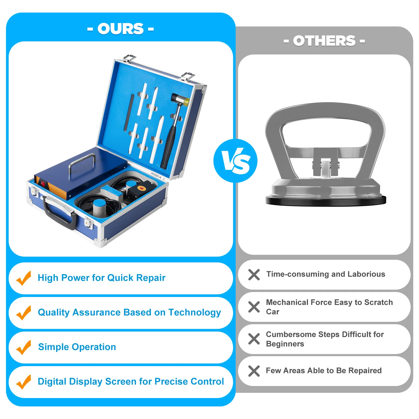 Il peut facilement éliminer diverses bosses rondes et lisses, adaptées aux salons de beauté automobiles, aux ateliers de réparation automobile, aux magasins 4S et aux réparations à la maison.