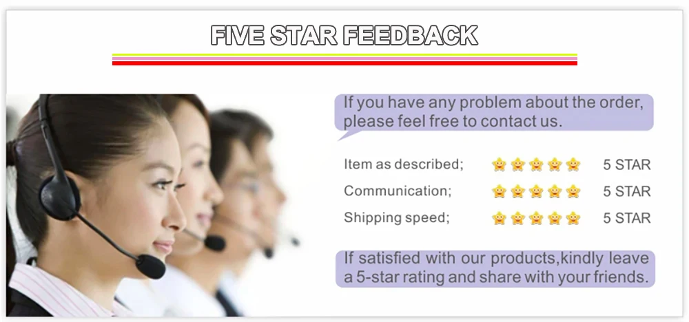 1.Nous comptons sur notre réputation et la satisfaction de nos clients pour réussir.Par conséquent, vos commentaires sont extrêmement importants pour nous.Veuillez nous laisser un commentaire 5 étoiles si vous êtes satisfait de nos produits et services.
