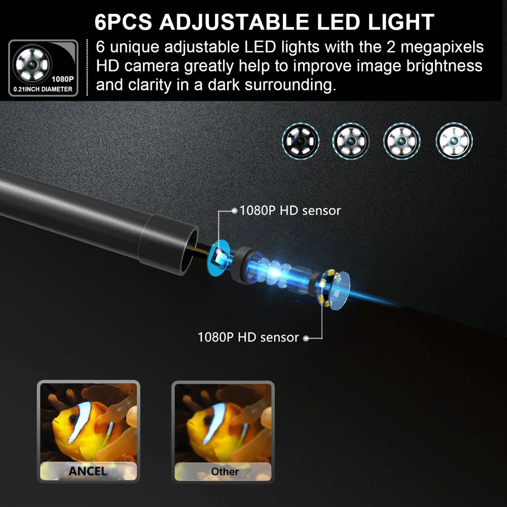 6Pcs LED light, With its 6 adjustable LED lights, this endoscope camera for iphone & Android makes it easier to view objects in the dark or when in low-light areas without the hassle of experiencing overexposure issues.