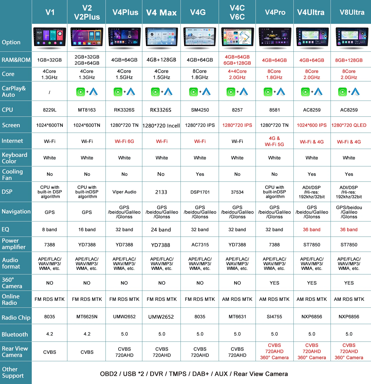 - Special Features: Haut-parleur / microphone intégré,fonction wifi,supporte la commande au volant,Soutien 4G réseau,Supporte Can-Bus,GPS intégré,Chargeur,Téléphone mobile,Lecteurs mp3,Commande vocale,DSP,Carplay,Android Auto,Inversion d’entrée,Écran partagé