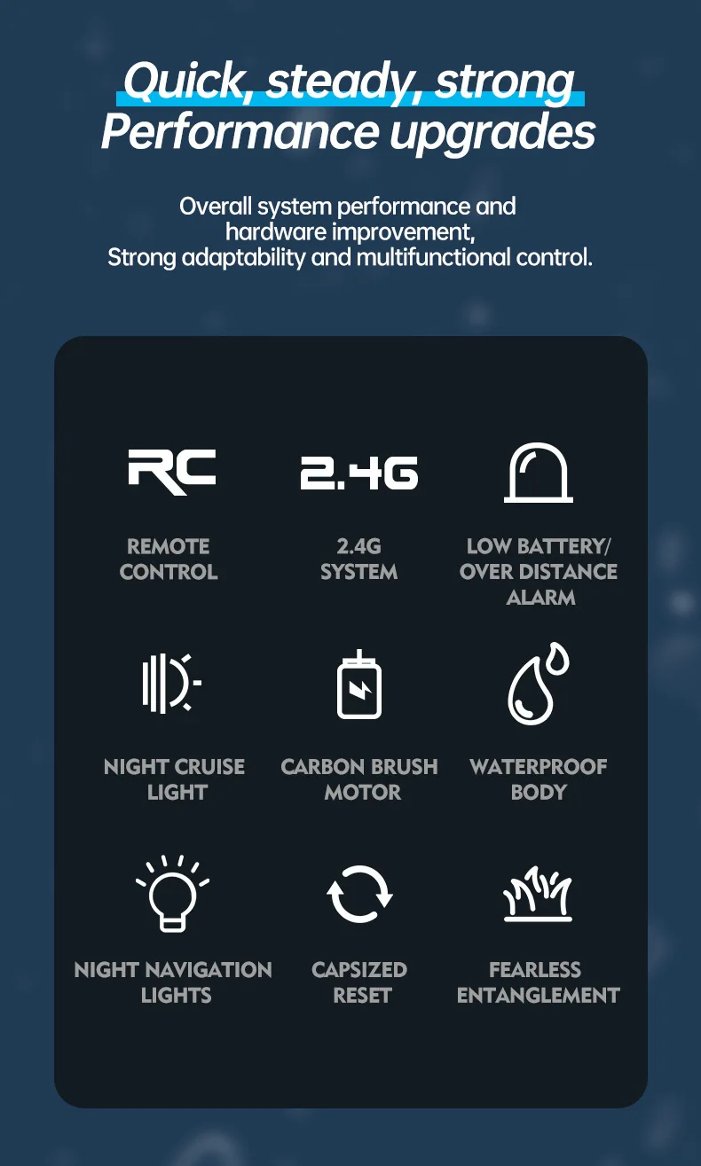 Caractéristique : avant/arrière/gauche/droite, pilote de turbo (hélices exposées externes plus sûres), réinitialisation de capsulage, alarme de batterie faible à deux étages, lumière (peut être allumée/éteinte), structure de refroidissement par eau en circulation, réglage fin, règles du gouvernail d’accélérateur, réglage du volume du gouvernail de direction