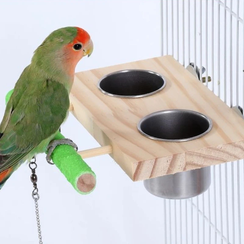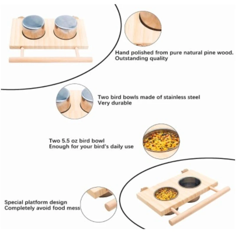 Bird Feeder Stainless Steel Pet Parrot Feeding Bowl with Wooden Stand Feeding Watering Supplies for Birds Double Bowl