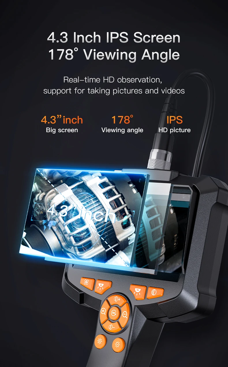 • Écran IPS de 4.3 pouces:L’endoscope dispose d’un écran IPS de 4.3 pouces, offrant des couleurs vibrantes et des angles de vision larges pour une qualité d’image supérieure.