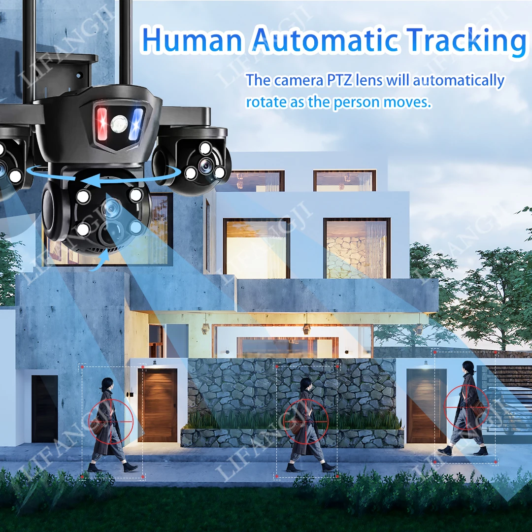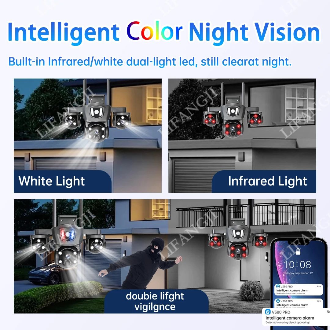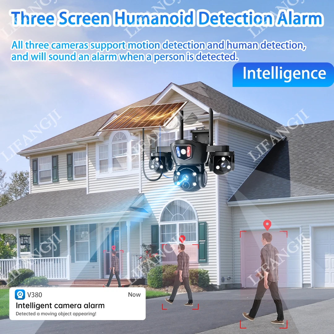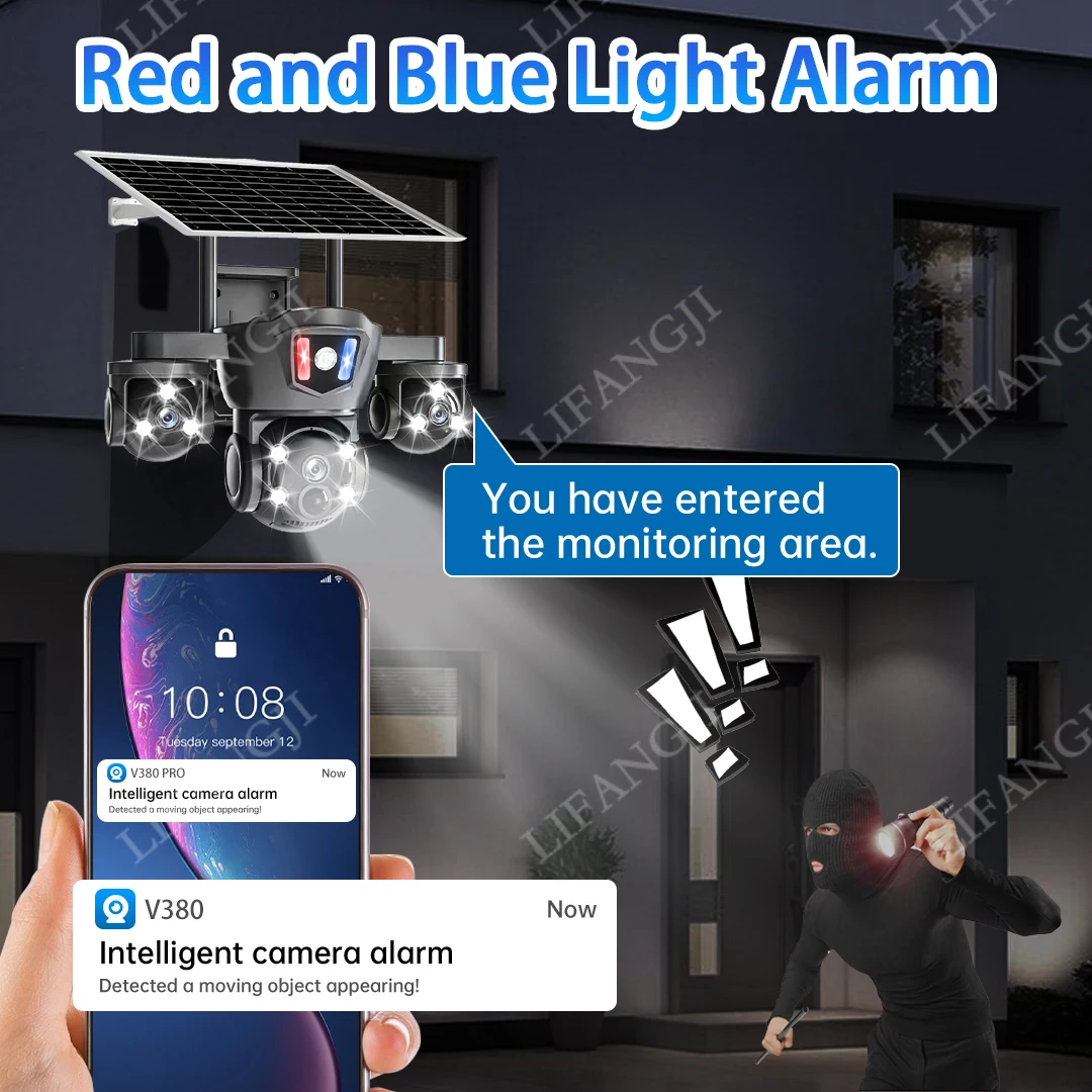 When the surveillance detects human intrusion, it will emit red and blue alarm flashing lights and send mobile phone notifications