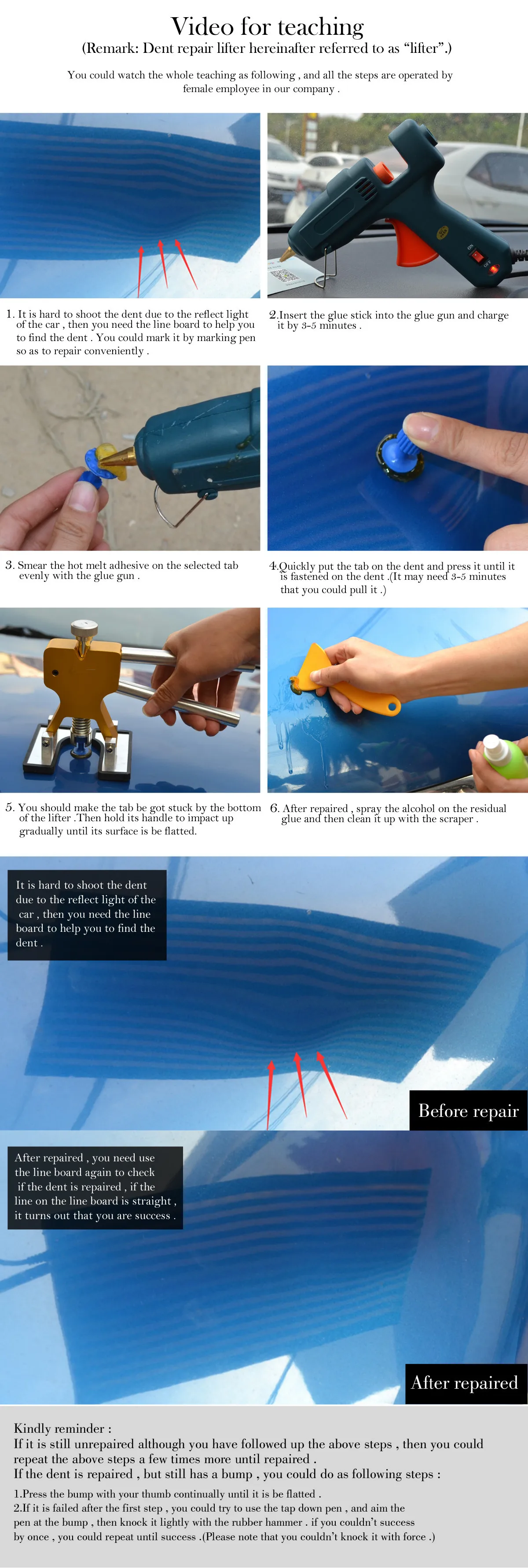 Ne vous inquiétez pas de la façon d’utiliser ce kit même si vous ne le manipulez jamais auparavant.Notre emballage est livré avec une introduction détaillée des étapes de réparation pour le fonctionnement, ce qui facilite le processus de débosselage.
