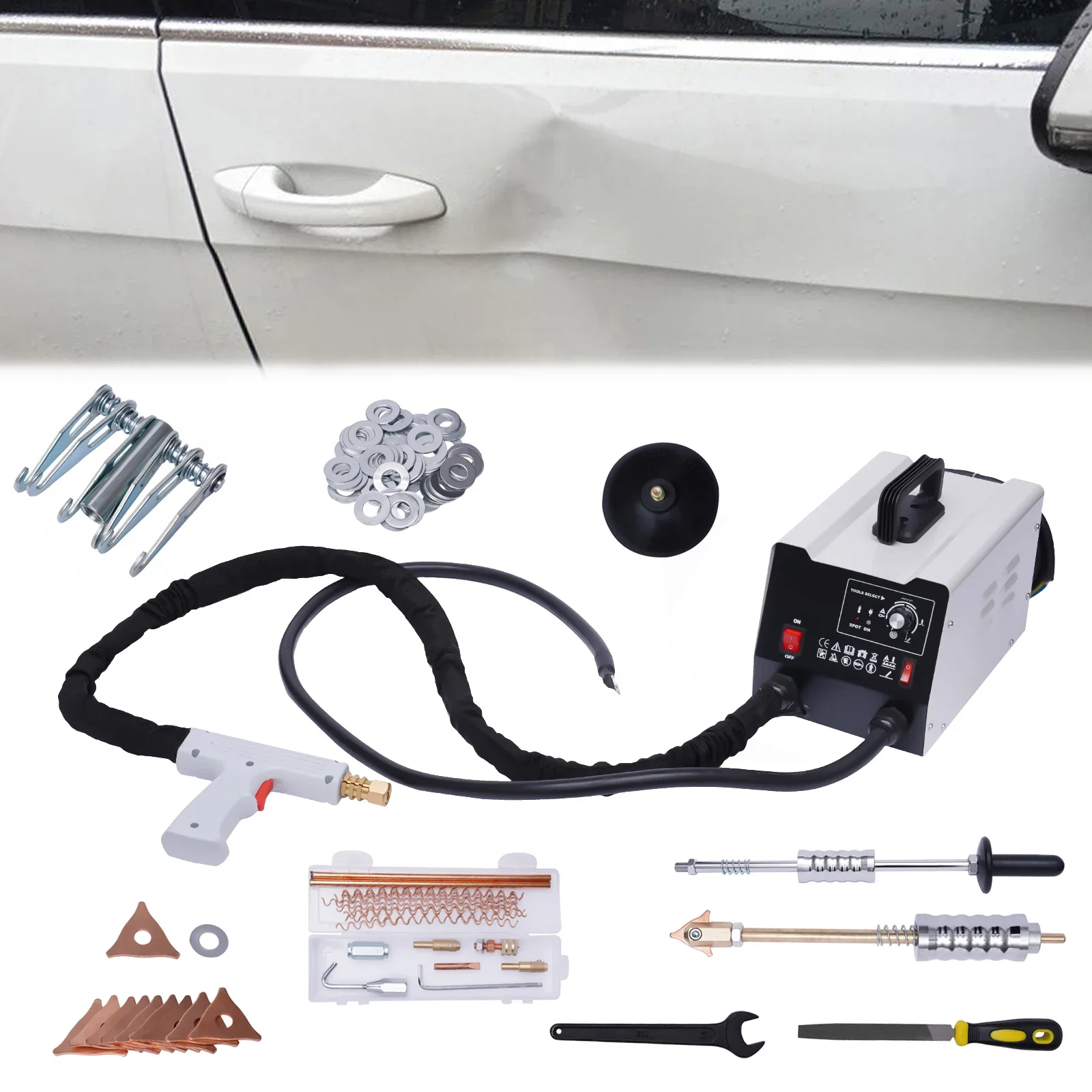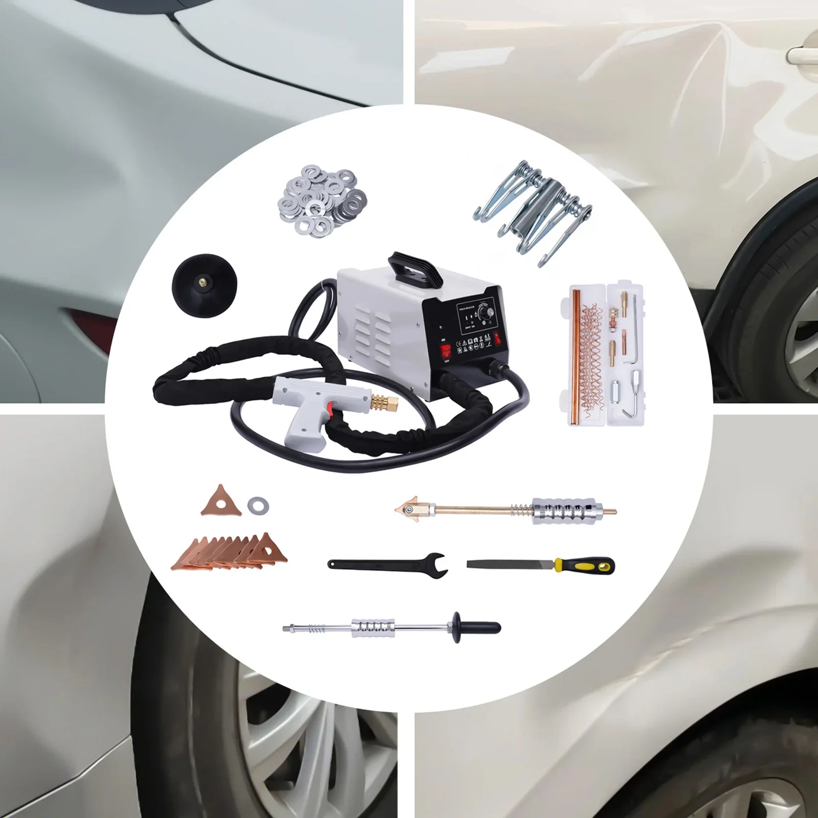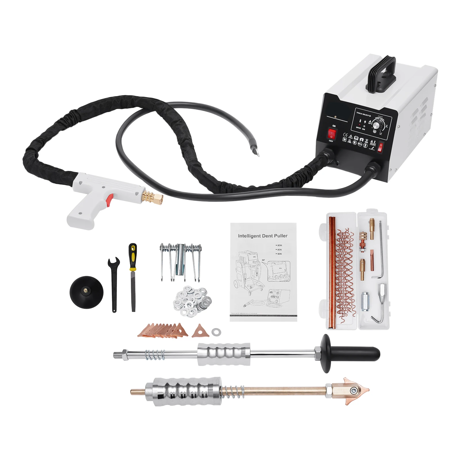 Accessoires complets : l’unité principale de débosselage, le pistolet de soudage et d’autres accessoires tels que les fils ondulés, les tiges de carbone et les crochets peuvent répondre à vos différents types de besoins de soudage sans acheter de pièces supplémentaires, ce qui vous permet d’économiser de l’argent et de rendre votre travail de soudage plus professionnel.