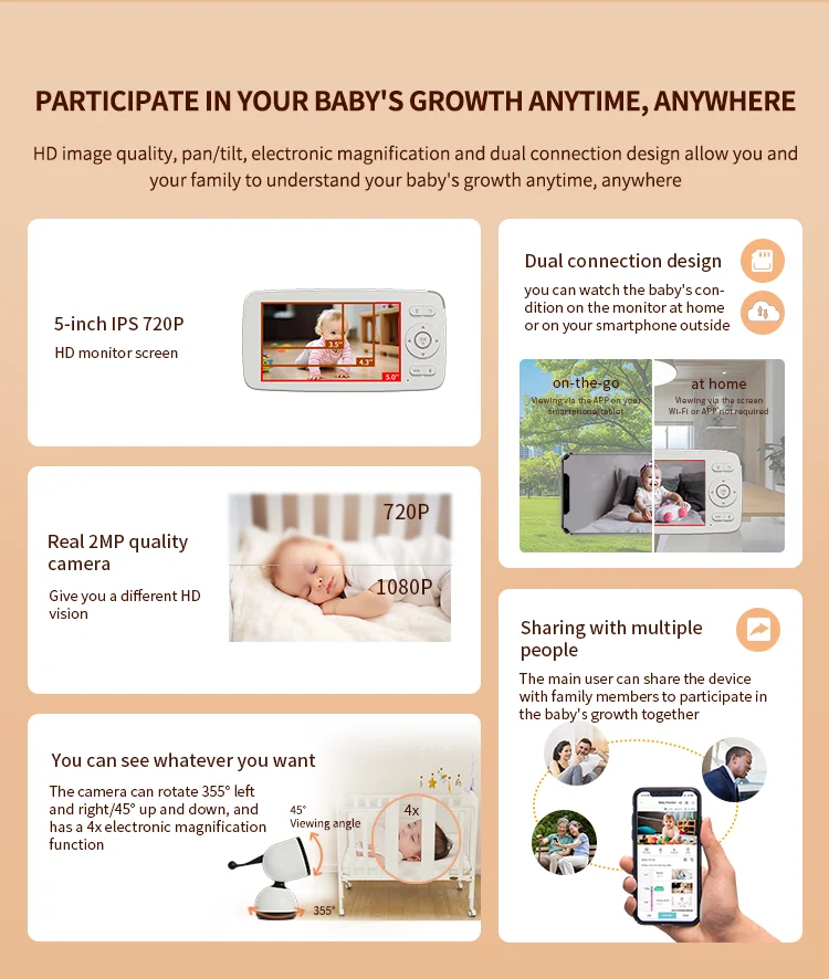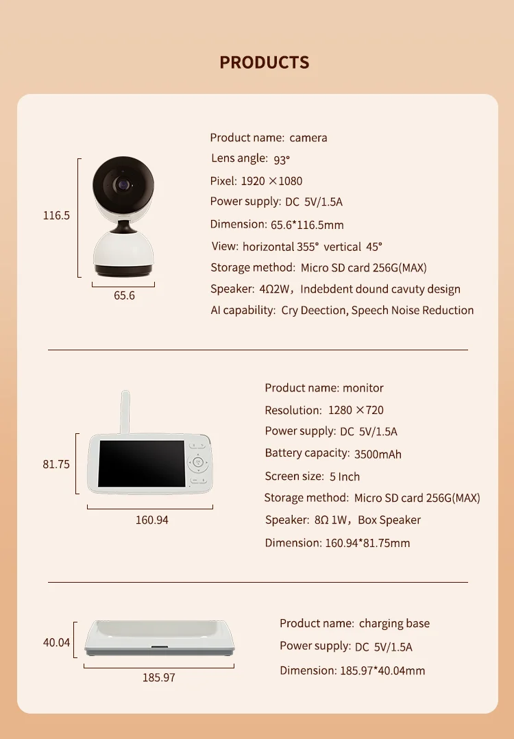 - Caractéristique: Interphone,Réseau IP,Application pour téléphone mobile,Alarme de cri de bébé,Détection de mouvement,Rappel du temps d’alimentation,Contrôle de la température,Surveillance de l’humidité,Ecran lcd,Musique