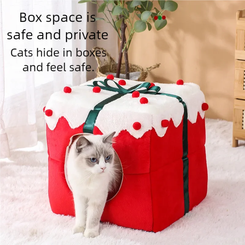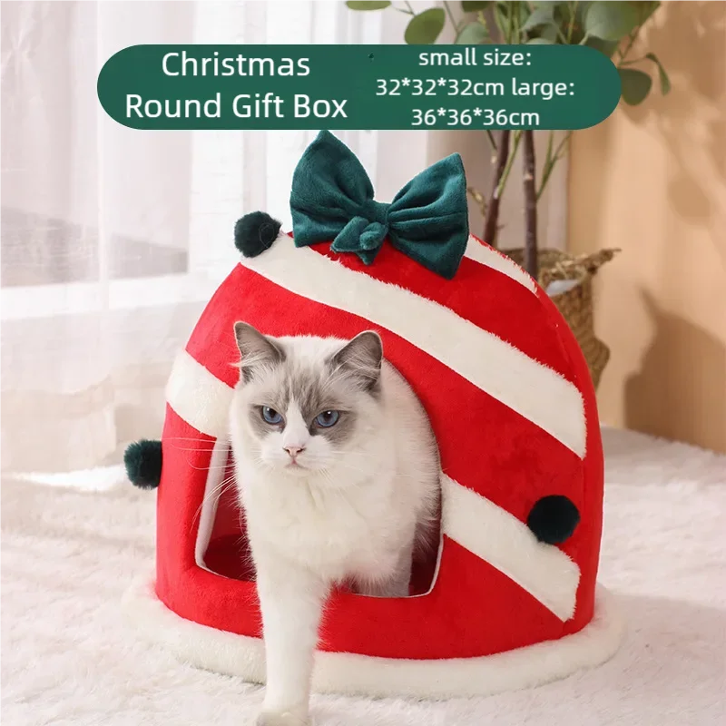 Nid de chat fermé d’hiver, boîte cadeau de noël, maison de couchage pour chats, chiens, lit doux et chaud, chatons, chiots, fête pour animaux de compagnie, décembre, fête de noël