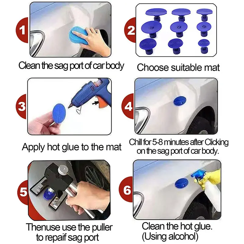 Faire emprunter cet outil peut réparer les bosses qui répondent aux conditions de ce produit, et vous pouvez l’utiliser vous-même sans vous rendre dans un atelier de réparation.La méthode de fonctionnement est la suivante : ;