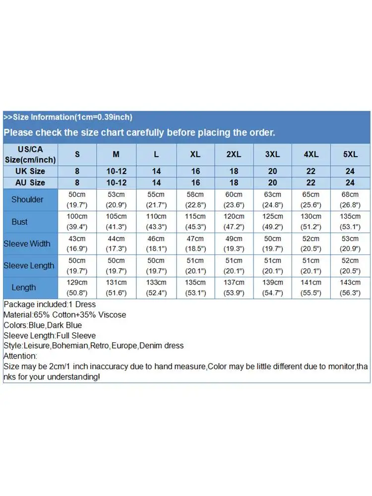 | Emballage inclus: 1 robe Matériau: 65% coton + 35% viscose Couleurs: Bleu, Bleu foncé Longueur des manches: manches complètes Encolure: Col rabattu Motif: couleur unie Longueur: Longueur de cheville Chaîne à boucle: Bouton vers le bas avant Épaisseur: Mince Style: Loisirs, Bohème, Rétro, Europe, Robe en jean Saison: printemps, automne, hiver Occasion: Famille, Fête, Plage, Mariage, Vacances, Emploi Étiquette: Oui Attentions: 1. L’objet réel peut exister légèrement des différences de couleurs par rapport aux images affichées par différents ordinateurs. Attention, merci. 2. Il peut y avoir une erreur de mesure manuelle de 1 à 3 cm. Désolé pour tout inconvénient. 3. Veuillez vous prévaloir sur l’article réel, les images du modèle à titre de référence uniquement. 4.Attention!!! Veuillez vérifier attentivement le tableau des tailles avant de passer commande.